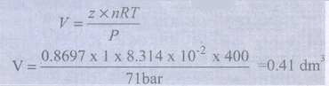 V = (0.8697 × 1 × 8.314 × 10−2 × 400) / 71bar = 0.41 dm3