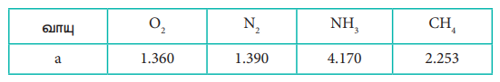 12) வாயுக்களின் வாண்டர் வால்ஸ் மாறிலி aயின் மதிப்பு (dm3)2 atm. mol-2- ல் கீழ்க்கண்டுள்ள அட்டவணையில் கொடுக்கப்பட்டுள்ளது