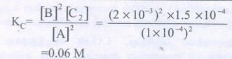 8. 2A(g) ⇌ 2B(g) + C2(g) என்ற சமநிலையில், 400K வெப்பநிலையில் A, B மற்றும் C2 வின் சமநிலைச்செறிவுகள் முறையே 1 × 10-4 M. 2.0 × 10-3 M, 1.5 × 10-4 M. 400K, வெப்பநிலையில் சமநிலையின் KC மதிப்பு யாது?
