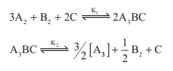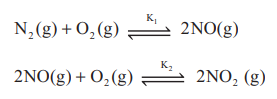 ஆகிய சமநிலைகளுக்கு ஒரு குறிப்பிட்ட வெப்பம் மற்றும் அழுத்த நிலையில் சமநிலை மாறிலிகளின் மதிப்புகள் கொடுக்கப்பட்டுள்ளன. K1 மற்றும் K2 விற்கு இடையேயான தொடர்பு யாது?