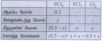 13. PCl5 ⇌ PCl3 + Cl2 என்ற வினையின், சமநிலையில், PCl5 ன் சிதைவடைதல் பின்னம் x, PCl5 ன் தொடக்கச் செறிவு 0.5 மோலாக இருந்தால், சமநிலையில் வினைபடு பொருள்கள் மற்றும் வினைவிளை பொருள்களின் மொத்த மோல்கள் எண்ணிக்கை