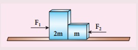 8. படத்தில் காட்டியவாறு வழுவழுப்பான கிடைத்தள பரப்பில் m, 2m நிறைகள் வைக்கப்பட்டுள்ளன. முதல் நிலையில் F1 விசை, இடப்புறமிருந்து செயல்படுத்தப் படுகிறது, பிறகு F2 விசை மட்டும் வலப்புறமிருந்து செயல் படுத்தப்படுகிறது. பொருள்கள் ஒன்றையொன்று தொடும் பரப்பில், இருநிலைகளிலும் சமவிசைகள் செயல்படுகின்றன எனில் F1 :F2 (இயற்பியல் ஒலிம்பியாட் 2016)