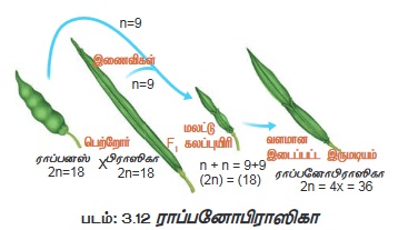 எடுத்துக்காட்டு:1 ராப்பனோபிராஸிகா, G.D. கார்பெசென்கோ (1927) ரஷ்ய மரபியலாளர், முள்ளங்கி (ராப்பனஸ் சட்டைவஸ், 2n=18) மற்றும் முட்டைக்கோஸ் (பிராஸிகா ஒலிரேசியா, 2n=18) தாவரங்களைக் கலப்பு செய்து முதலாம் மகவுச் சந்ததியில் (F1) மலட்டுத் தன்மை கொண்ட கலப்புயிரிகளை உற்பத்தி செய்தார். அவர் முதலாம் மகவுச் சந்ததி (F1) களிடையே குரோமோசோம் இரட்டிப்பு செய்யும் போது அவைகள் வளமானதாக (fertile) மாறின. முள்ளங்கித் தாவர வேரும் முட்டைக்கோஸ் தாவர இலைகளையும் கொண்ட முழுத் தாவரமும் உண்ண க்கூடியதாக இருக்கும் என அவர் எதிர்பார்த்தார், ஆனால் அவரின் எதிர்பார்ப்பிற்கு மாறாக இருந்ததால் பெரிதும் ஏமாற்றமடைந்தார்.