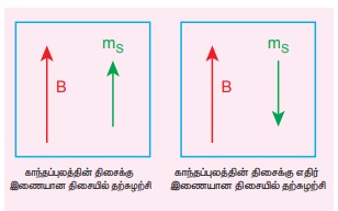 திசைக்கு இணையாகவோ அல்லது எதிர் - இணையாகவோ ஒருங்கமையும். இதிலிருந்து எலக்ட்ரானின்