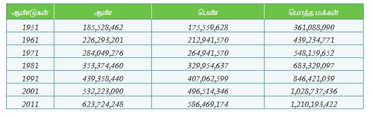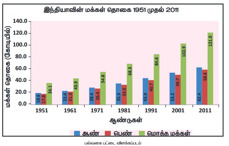 12.4 அட்டவணையில் கொடுக்கப்பட்டுள்ள தரவிற்கு பல்வகை பட்டை விளக்கப்படம் வரைக. அட்டவணை 12.4 இந்தியாவின் மக்கள் தொகை 1951 முதல் 2011
