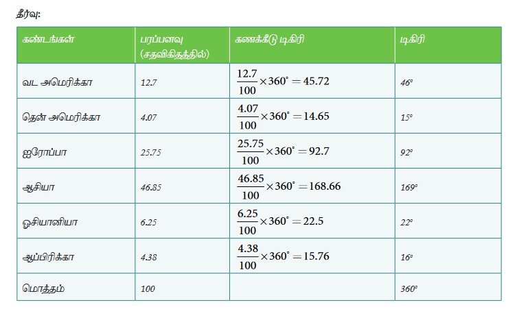 3. கோணத்தின் மதிப்ப:= கூறுகளின் மதிப்பு / மொத்த மதிப்பு X 360 என்ற சூத்திரத்தைப் பயன்படுத்தி கோணத்தின் மதிப்பைக் கணக்கிடலாம்.