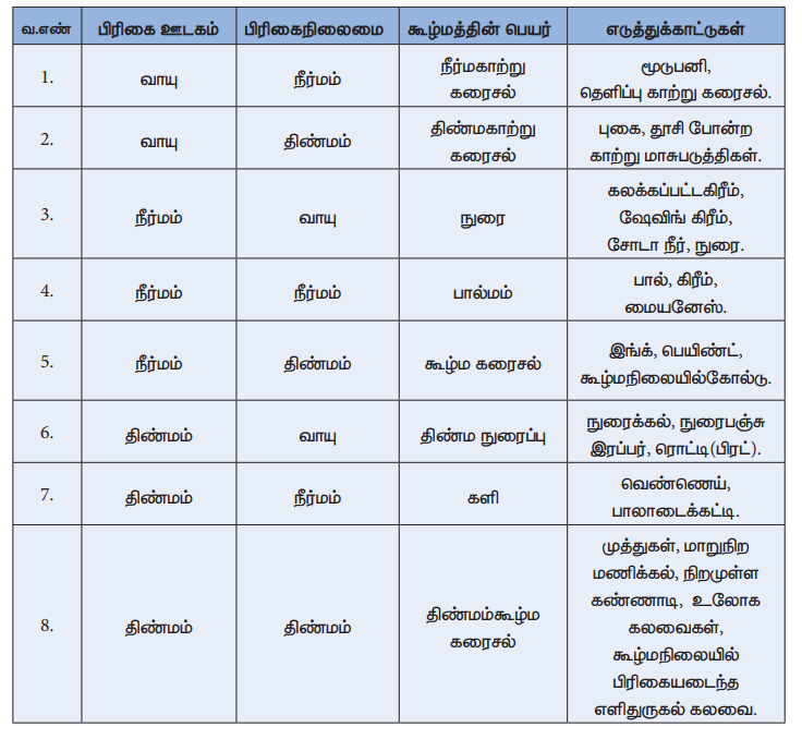 கூழ்மங்களின் வகைகள் பின்வரும் அட்டவணையில் பட்டியலிடப்பட்டுள்ளது.