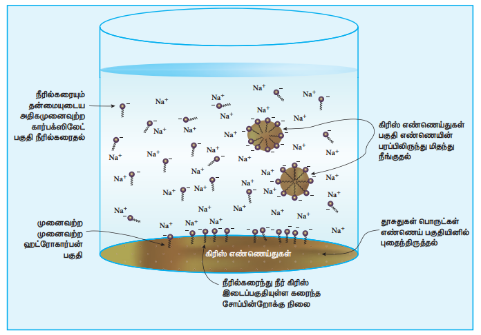 முனைவுற்ற பகுதியானது நீர்வெறுக்கும் தன்மை கொண்டது. ஆனால் முனைவுற்ற பகுதியானது நீர்விரும்பும் தன்மை கொண்டது. நீர்வெறுக்கும் முனைவற்ற பகுதியானது எண்ணெய் மற்றும் பிசுக்கில் கரைகிறது. ஆனால் நீரில் கரைவதில்லை. நீர்விரும்பும் கார்பாக்ஸிலேட் தொகுதியானது நீரில் கரைகிறது. தூசித் துகள்கள் அல்லது எண்ணெய் பிசுக்கு ஆகியன துணிகளில் அழுக்காக ஒட்டிக்கொண்டுள்ளன. துணிகளில் எண்ணெய் அல்லது பிசுக்கு ஒட்டிக்கொண்டுள்ள பகுதியில் சோப்புகளை சேர்க்கும்போது, சோப்பின் ஹைட்ரோகார்பன் பகுதியானது பிசுக்கில் கரைகிறது, எதிர்மின் சுமைகொண்ட கார்பாக்ஸிலேட் முனையானது பிசுக்கின் மேற்பகுதியில் வெளியே நீட்டிக்கொண்டுள்ளது.
