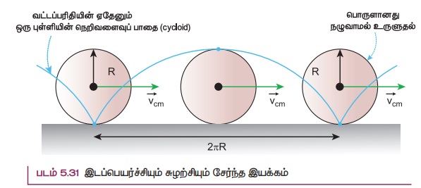 உருளும் இயக்கத்தில் இடப்பெயர்ச்சி மற்றும் சுழற்சி இயக்கங்கள் எவ்வாறு தொடர்புடையது என்பதை இப்பகுதியில் பயிலலாம். சுழலும் தட்டின் ஆரம் R எனில் ஒரு முழு சுழற்சியின் போது அதன் நிறைமையமானது அடையும் இடப்பெயர்ச்சி 2πR ஒரு முழு சுழற்சியின் போது நிறைமையம் மட்டுமல்லாமல் வட்டத்தட்டில் உள்ள அனைத்து துகள்களும் அதே அளவான 2πR, இடப்பெயர்ச்சியை அடைந்துள்ளது இந்நிகழ்வில் நிறைமையமானது நேர்கோட்டுப் பாதையில் இயங்குகின்றது. ஆனால் மற்ற புள்ளிகள் அனைத்தும் இடப்பெயர்ச்சி மற்றும் சுழற்சி ஆகிய இரண்டு இயக்கங்களையும் பெற்றுள்ளன. வட்டத்தட்டின் விளிம்பில் உள்ள புள்ளி மேற்கொள்ளும் பாதையை படம் 5.31 தெளிவாக விளக்குகிறது. இது மேற்கொள்ளும் சிறப்புப் பாதைக்கு சைக்ளாய்டு (cycloid) என்று பெயர்.