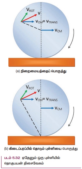 நிறை மையத்தின் திசைவேகம் VCM என்பது இடப்பெயர்ச்சி திசைவேகம் VTRANS (VCM = VTRANS) க்குச் சமம். மற்ற அனைத்து புள்ளிகளும் இரு திசைவேகங்களை பெற்றுள்ளன. முதலாவதாக இடப்பெயர்ச்சித் திசைவேகம் (VTRANS) [நிறைமையத்தின் திசைவேகத்தை போன்றே] மற்றும் இரண்டாவதாக சுழற்சித் திசைவேகம் VROT (VROT = r ω இங்கு r என்பது நிறை மையத்திலிருந்து புள்ளியின் தொலைவு மற்றும் ω கோணத்திசை வேகம்). ஒரு குறிப்பிட்ட கணத்தில் நாம் கருதிய புள்ளியின் திசைவேகம் VROT ஆனது நிலைவெக்டருக்கு செங்குத்தாக படம் 5.32 (a) இல் அமையும் இவ்விரு திசைவேகங்களின் தொகுபயன் திசைவேகம் V எனப்படும். பொருளானது உருளும் நிலையில் கிடைப்பரப்பை தொடும் புள்ளியிலிருந்து பெறப்படும் நிலை வெக்டருக்கு செங்குத்தாக தொகுபயன் திசைவேகம் V அமைந்திருப்பதை படம் 5.32(b) இல் காணலாம்.