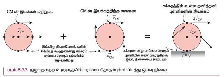 நழுவுதலற்ற உருளுதலின் போது கிடைப்பரப்பை தொடும் புள்ளியிலிருந்து அமைதி நிலையை அடைவதால் விளைவுத் திசைவேகம் V சுழியாகிறது (V = 0) உதாரணமாக, படம் 5.33, லிருந்து VTRANS முன்னோக்கியும் மற்றும் VROT பின்னோக்கியும் எண்ணளவில் சமமாகவும் ஒன்றுக் கொன்று எதிர் திசையிலும் இருப்பதை VTRANS- VROT = O குறிக்கிறது. VTRANS மற்றும் VROT ஆகியவை நழுவுதலற்ற உருளுதலின் போது பொருளின் விளிம்பில் உள்ள அனைத்து புள்ளிகளும் கிடைப்பரப்பைத் தொடும் போது VTRANS மற்றும் VROT எண்ண ளவில் சமமாகவும் உள்ள து (VTRANS = VROT) எனக் கூற இயலும். எனவே VTRANS = VCM மற்றும் VROT = R ω, எனும் போது நழுவுதலற்ற உருளுதல் பின்வருமாறு எழுதப்படுகிறது.
