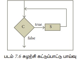 படம் 7.6ல் சுழற்சிக் கட்டுப்பாட்டு பாய்வு, பாய்வுப்படமாக கொடுக்கப்பட்டுள்ளது. அதில், C என்ற நிபந்தனை பெட்டி, True மற்றும் False எனக்குறிக்கப்பட்ட இரண்டு வெளியேறும் அம்புக்குறிகளை கொண்டுள்ளது. True என்ற அம்புக்குறி S பெட்டியை நோக்கி சுட்டுகிறது. நிபந்தனை C மெய் எனில், S பெட்டி இயங்கும். பின்னர், கட்டுப்பாட்டு பாய்வு C பெட்டிக்கு திரும்பி விடும். False என குறிக்கப்பட்ட அம்புக்குறி, சுழற்சி உடற்பகுதிக்கு (புள்ளிகளால் அமைக்கப்பட்ட பெட்டி) வெளியே செல்கின்றது. C நிபந்தனை மதிப்பு பொய் எனில், மடக்கு முடிவுற்று, கட்டுப்பாட்டு பாய்வு, மடக்கிற்கு அடுத்து உள்ள பெட்டிக்கு செல்லும்.