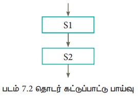 என எழுதவேண்டும். இந்த தொடர் கூற்றில், S1 முதலிலும், S2 இரண்டாவதாகவும் இயங்கும். படம் 7.2ல் இந்த இரண்டு கூற்றுகளின் பாய்வை காட்டும் பாய்வுப் படம் கொடுக்கப்பட்டுள்ளது. அதில், S1 லிருந்து S2க்கு செல்லும் அம்புக்குறி, முதலில் S1 இயங்கி, அதன் பின் S2 இயங்கும் என்பதை காட்டுகிறது.