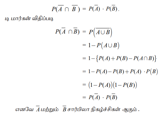 (2) A மற்றும் B சார்பிலா நிகழ்ச்சிகள் எனில் அவை ஒன்றையொன்று விலக்கிய நிகழ்ச்சிகளாக இருக்க இயலாது (நிரூபணம் தேவையில்லை).