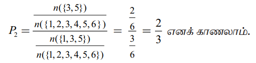 அதாவது S1 = {1,3,5} என்ற உட்கணத்திற்குக் கட்டுப்படுத்துகிறோம். பிறகு 2 -க்கு மேற்பட்ட ஒற்றைப்படை எண் கிடைப்பதற்கான நிகழ்தகவு P2