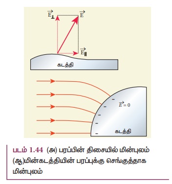 கடத்தியின் பரப்புக்கு செங்குத்தான திசையில் மட்டுமே மின்புலம் அமையும் [படம் 1.44