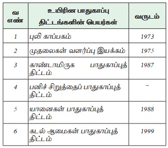 அட்டவணை 7.1 இந்தியாவில் உள்ள உயிரின் பாதுகாப்பு திட்டங்கள்