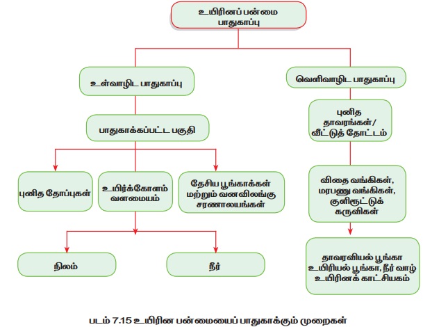 இந்த பாதுகாப்பு முறையை இரண்டு வகையாகப் பிரிக்கலாம் (படம் 7.15). உயிரிகளின் இயல்புச் சூழலில் அவற்றை பாதுகாப்பது. மற்றொன்று இயல்பு வாழ்விற்கு வெளியில் அவற்றை பாதுகாப்பது ஆகும்.