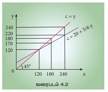 இந்த வரைபடத்தில் வருமானம் M = 120 ஆக இருக்கும் போது நுகர்வும் (C) 120 ஆக உள்ளது (B - என்னும் புள்ளியில்).