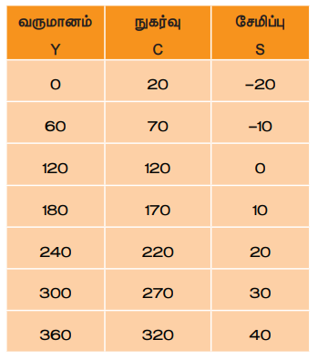 வருமானம் பூஜ்யம் (Y = 0) ஆனாலும் நுகர்வுச் செலவு 100 ஆக (C =100) இருக்கும். வருமானம் 100 (Y=100) எனில் நுகர்வுச் செலவு 180 (C=180) ஆகவும். வருமானம் 200(Y=200) எனில் நுகர்வுச் செலவு 260 (C = 260)ஆகவும், வருமானம் 300 (Y = 300) எனில் நுகர்வுச் செலவு 340 (C = 340) ஆகவும் இருக்கும்.