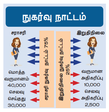 அதிகரித்த ₹60 கோடி வருமானம் இரண்டாக, நுகர்விற்கும், சேமிப்பிற்கும் இடையே முறையே பிரிக்கின்றது. (அதாவது ₹50 கோடிகளில் மற்றும் ₹10 கோடிகளில்)