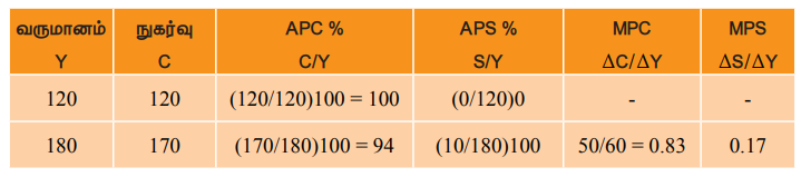120 லிருந்து 180 ஆக வருமானம் அதிகரிக்கும் பொழுது நுகர்வும் 120லிருந்து 170ஆக அதிகரிக்கின்றது. ஆனால் அதிகரித்த நுகர்வு அதிகரித்த வருமானத்தை காட்டிலும் 10 குறைவு. அது சேமிக்கப்படுகிறது.