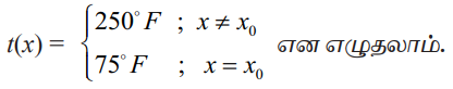 உதாரணமாக, ஒரு வெப்பமானி T ஆனது L நீளமுள்ள சூடான கம்பியின் வெப்ப நிலையைப் பதிவு செய்வதாகக் கொள்வோம். L−ன் மீதுள்ள ஒவ்வொரு புள்ளி x−லும் அதன் வெப்பநிலை t(x) என்க. L நீளமுள்ள கம்பியில் x0 −ஐ அடையும் வரை அதன் வெப்பநிலை 250°F எனக் கொள்வோம். x0 என்ற புள்ளியில் திடீரென்று வெப்பநிலையானது (insulation) காப்பின் காரணமாக அறையின் வெப்பநிலையான 75°F −க்குக் குறைகின்றது. x0 −க்குப் பிறகு அதன் வெப்ப நிலை 250°F ஆகத் தொடர்கிறது எனில் சார்பின் குறியீட்டால்