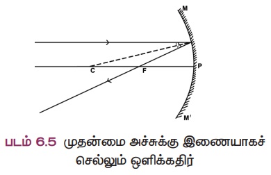 முதன்மை அச்சுக்கு இணையாகச் செல்லும் ஒளிக்கதிர், எதிரொளிக்கப்பட்ட பின்பு, முக்கியக் குவியம் வழியாகச்செல்லும் அல்லது முக்கிய குவியத்திலிருந்து (குழி ஆடிகளில்) வருவது போல் தோன்றும் (படம் 6.5).