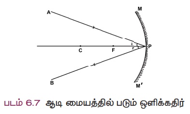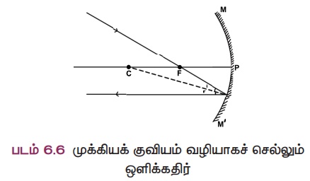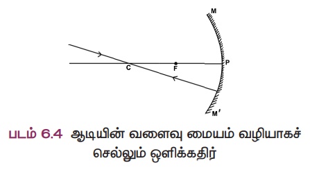 ஆடியின் வளைவு மையம் வழியாகச் செல்லும் ஒளிக்கதிர், எதிரொளிக்கப்பட்ட பின்பு, அதே பாதையில் திரும்பிச் செல்லும் (படம் 6.4).