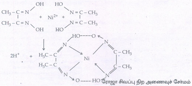 4. டை மீத்தைல் கிளையாக்ஸைமின் ஆல்கஹால் கலந்த கரைசலைப் பயன்படுத்தி Ni + கண்டறியப்படுகிறது. இவ்வினையில் உருவாகும் ரோஜா சிவப்பு நிற அணைவுச் சேர்மத்தின் வாய்ப்பாட்டினை எழுதுக