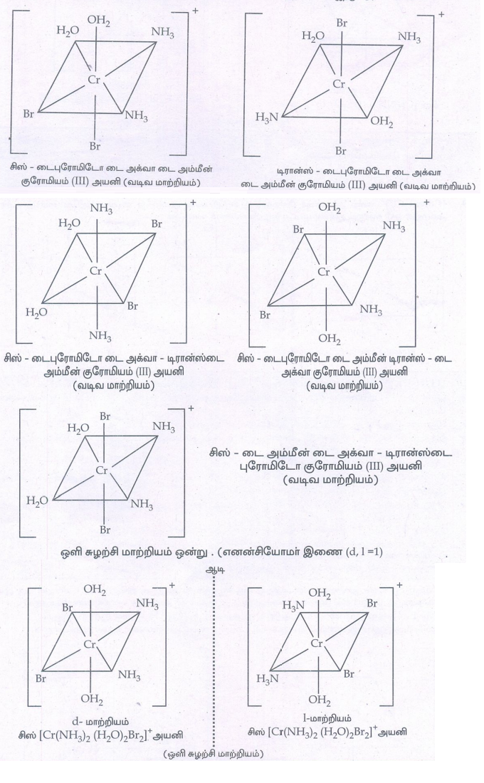 • (எ.கா): [CoCl2(en) 2]+ இதன் இரண்டு சிஸ் அமைப்புகள் ஒளி சுழற்றும் பண்பு உடையவை. ஒரு டிரான்ஸ் அமைப்பு ஒளி சுழற்றும் தன்மையற்றது