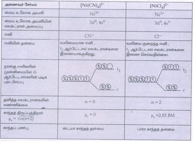 19. [Ni(CN)4]2- டையா காந்தத் தன்மை உடையது ஆனால் [Ni(Cl)4]2- பாரா காந்தத் தன்மை உடையது படிகபுலக் கொள்கையினைப் பயன்படுத்தி விளக்குக.