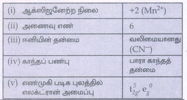 30. K4[Mn(CN)6] அணைவின், மைய உலோக அயனியின் ஆக்சிஜனேற்ற நிலை, அணைவு எண், ஈனியின் தன்மை, காந்தப்பண்பு மற்றும் எண்முகி படிக புலத்தில் எலக்ட்ரான் அமைப்பு ஆகியனவற்றைத் தருக.