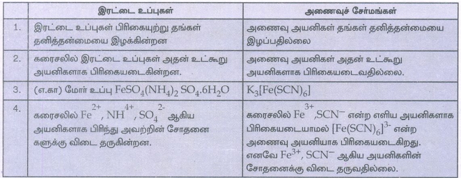 17. இரட்டை உப்புகள் மற்றும் அணைவுச் சேர்மங்களுக்கு இடையேயான வேறுபாடுகள் யாவை?