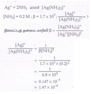 6. [Ag(NH3) 2]+ என்ற அணைவுச் சேர்மத்தின் நிலைப்பு மாறிலி 1.7 x 107 எனில், 0.2 M NH3 கரைசலில், [Ag+]/[Ag(NH3)2] விகிதத்தினைக் கண்டறிக.