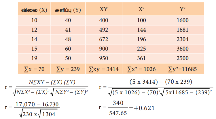 உதாரணம் 1 : பின்வரும் விவரங்களுக்கு உண்மைச் சராசரியை பயன்படுத்தும் சூத்திரத்தினை பயன்படுத்தி கார்ல் பியர்ஸனின் ஒட்டுறவுக் கெழுவினை கண்டறிக