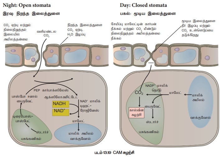 வளர்சிதைமாற்றம் - CAM சுழற்சி அல்லது கிராசுலேசியன் அமில வளர்சிதைமாற்றம் | 11th Botany : Chapter 13 : Photosynthesis