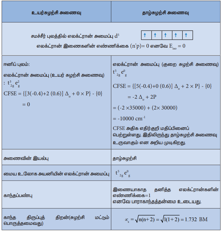 13. [CoF6 ] 3-அயனியின் சராசரி இணையாக்கும் ஆற்றலின் மதிப்பு 21000 cm-1 எண் மதிப்பு ∆o 13000cm-1 தாழ்சுழற்சி மற்றும் உயர் சுழற்சி ஆகிய இரு நிலைகளிலும் மேற்கண்டுள்ள அணைவுச் சேர்மத்திற்கு படிக புல நிலைப்படுத்தும் ஆற்றல் (CFSE) மதிப்பினைக் கண்டறிக.