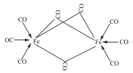 (i) டைஇரும்புநானாகார்பனைல் மூலக்கூறில் Fe2(CO)9, மூன்று இணைப்பு பால CO ஈனிகளும், ஆறு முனைய CO ஈனிகளும் காணப்படுகின்றன.