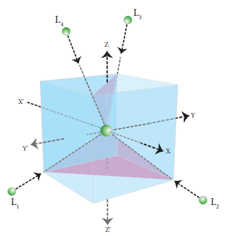 நான்முகி புலத்தில் ஈனிகள் அணுகும் விதத்தினை பின்வருமாறு காட்சிப்படுத்தி புரிந்து கொள்ளலாம். மைய உலோக அயனியை மையத்தில் கொண்டுள்ள (அதாவது படத்தில் காட்டியுள்ளவாறு ஆய அச்சுகளின் ஆதிப்புள்ளியில்) ஒரு கனச்சதுரத்தைக் கருதுக. கனச்சதுரத்தின் ஒன்றுவிட்டு ஒன்றாக அமைந்துள்ள மூலைகளிலிருந்து கனச்சதுரத்தின் முதன்மை மூலைவிட்டம் வழியே நான்கு ஈனிகளும் மைய உலோக அயனியை அணுகுகின்றன.