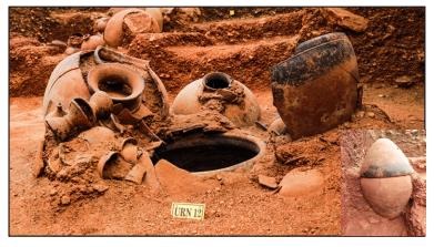 ஈமத் தாழிகள்: மண்-பாறை அடுக்குகளில் 3 முதல் 12 அடி ஆழத்தில் புதைக்கப்பட்டிருந்த ஈமத் தாழிகளில் எலும்புகள், இறந்தவர்களின் பயன்பாட்டிற்குத் தேவைப்படும் என்ற நம்பிக்கையில் வைக்கப்பட்ட பாத்திரங்கள், பொன், உயரளவு ஈயம்கொண்ட வெண்கல, இரும்புப் பொருள்கள் கிடைத்துள்ளன.