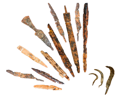 எறி வேல், ஈட்டி, குறுவாள் போன்ற 32 விதமான இரும்பினாலான கருவிகள் கிடைத்துள்ளன.