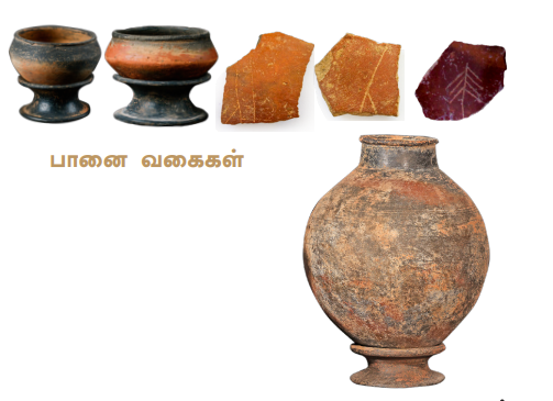 கருப்பு-சிவப்பு நிற பானை வகைகள், 500க்கும் மேற்பட்ட கீறல் குறியீடுகள் மற்றும் தமிழி (தமிழ் பிராமி) எழுத்துகள் பொறித்த பானையோடுகள் கிடைத்துள்ளன.