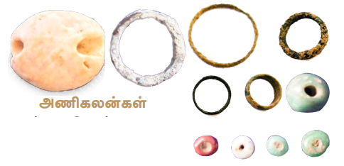 செம்பு, இரும்பாலான மோதிரங்கள், பொன், கண்ணாடி, தந்தம், எலும்பு மற்றும் சங்கினால் செய்யப்பட்ட மணிகளும் வளையல்களும் கிடைத்துள்ளன.