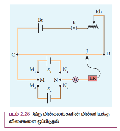 8. மின்னழுத்தமானியை பயன்படுத்தி இரு மின்கலங்களின் மின்னியக்கு விசைகள் எவ்வாறு ஒப்பிடப்படுகின்றன?