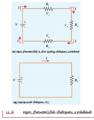 • எல்லா மின்தடையாக்கிகளிலும் ஒரே அளவிலான மின்னோட்டமே (I) பாயும்.