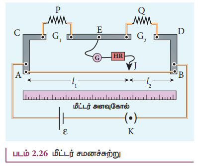 • இப்போது தொடு சாவியை நகர்த்தி கால்வனோமீட்டரில் சுழி விலக்கம் பெறப்பட்டு சமன்செய் நீளம் l1 அளவிடப்படுகிறது.