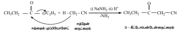 ஆ. α ஹைட்ரஜனைக் கொண்டுள்ள நைட்ரைல்கள் எஸ்டர்களுடன் ஈதரில் உள்ள சோடமைடு முன்னிலையில் குறுக்க வினைக்கு உட்பட்டு கீட்டோநைட்ரைல்களைத் தருகின்றது. இவ்வினை லெவைன்மற்றும் ஹௌசர் "LevineandHauser"அசிட்டைலேற்றவினை என அழைக்கப்படுகிறது. ஈத்தாக்சி தொகுதியானது (OC2H5) மீத்தைல் நைட்ரைல் (-CH2CN) தொகுதியால் பதிலீடு செய்யப்படுதலை இவ்வினை உள்ளடக்கியது.