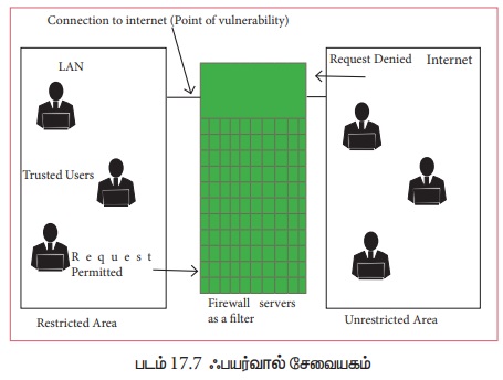 ஃபயர்வால் என்பது இயங்கு தளத்தின் ஒரு பகுதியைப் போன்ற சேவையாக அல்லது பாதுகாப்பு போன்ற ஏஜென்ட் பயன்பாட்டாக இருக்கலாம். ஒவ்வொன்றிலும் நன்மைகள் மற்றம் தீமைகள் உள்ளன. இருப்பினும் ஒவ்வொன்றுக்கும் அடுக்கு பாதுகாப்பில் ஒரு பங்கு உள்ளது. தகவல் தொடர்பு ஆரம்பிக்கப்படுதல், குறுக்கீடு செய்யப்படுதல், தொடர்புநிலை கண்டுபிடிக்கப்படுதல் ஆகியவற்றைப் பொறுத்து ஃபயர்வால்களின் வகைகள் மாறுபடுகின்றன. படம் 17.7ல் ஃபயர்வால் சேவையகம் வேலை செய்யும் விதத்தை காண்பிக்கிறது.
