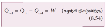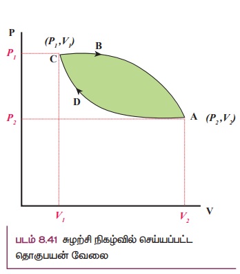 இந்த சுழற்சி நிகழ்வின் மூலம் செய்யப்பட்ட தொகுபயன் வேலை = W1 – W2 இது படம் 8.41 இல் காட்டப்பட்டுள்ள வளையப்பாதையின் நடுவே உள்ள பச்சை நிறமிடப்பட்ட பரப்பிற்குச் சமமாகும்.